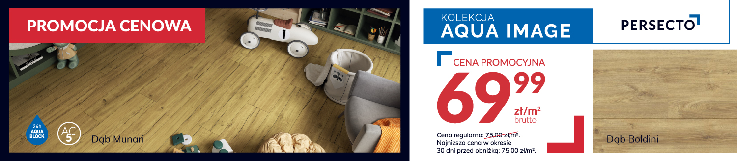 Poczuj radość ze swojego wnętrza i odkryj podłogi AQUA IMAGE marki PERSECTO by SWISS KRONO w atrakcyjnej cenie! Teraz za każdy m2 podłóg z powyższej kolekcji zapłacisz tylko 69,99 zł (najniższa cena 30 dni przed obniżką – 75 zł). Promocja potrwa od 20.03.2026 do 31.05.2026 r. Nie zwlekaj i postaw na piękną i trwałą podłogę do domu lub mieszkania!