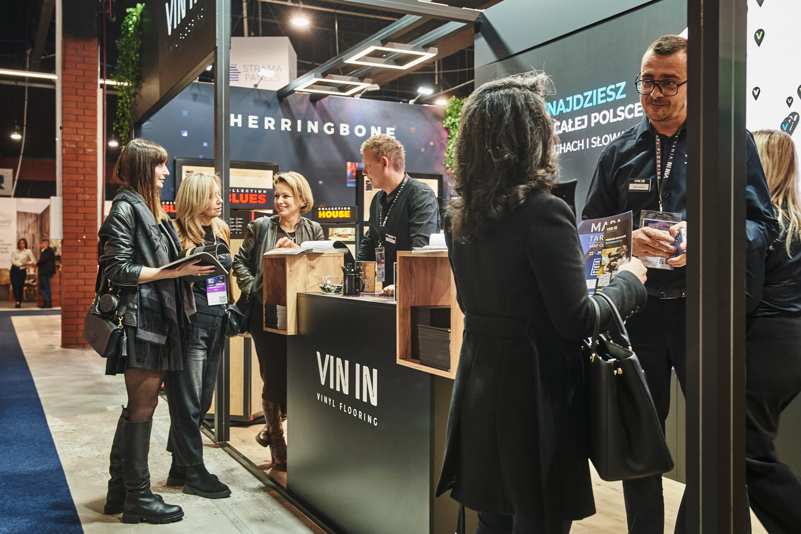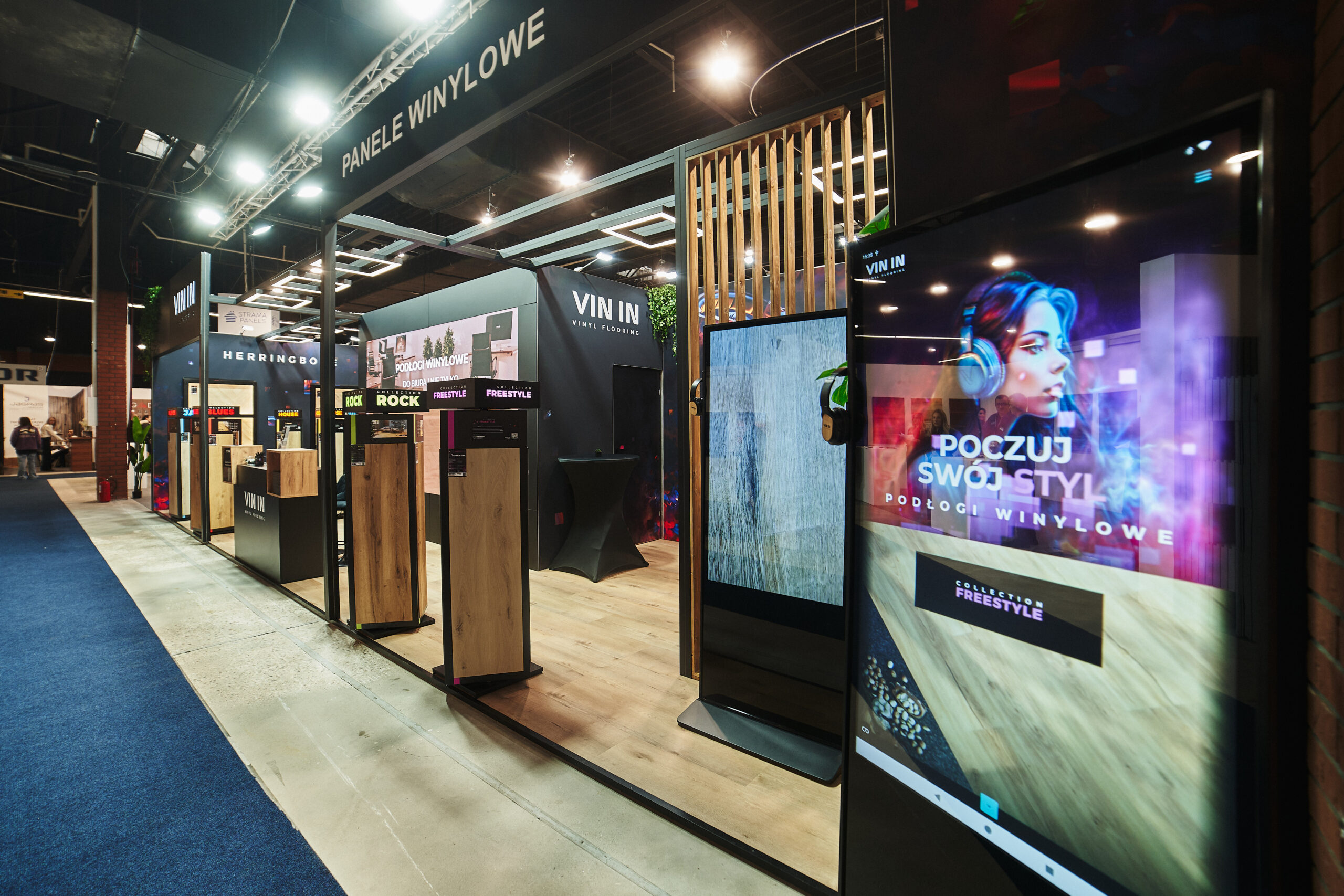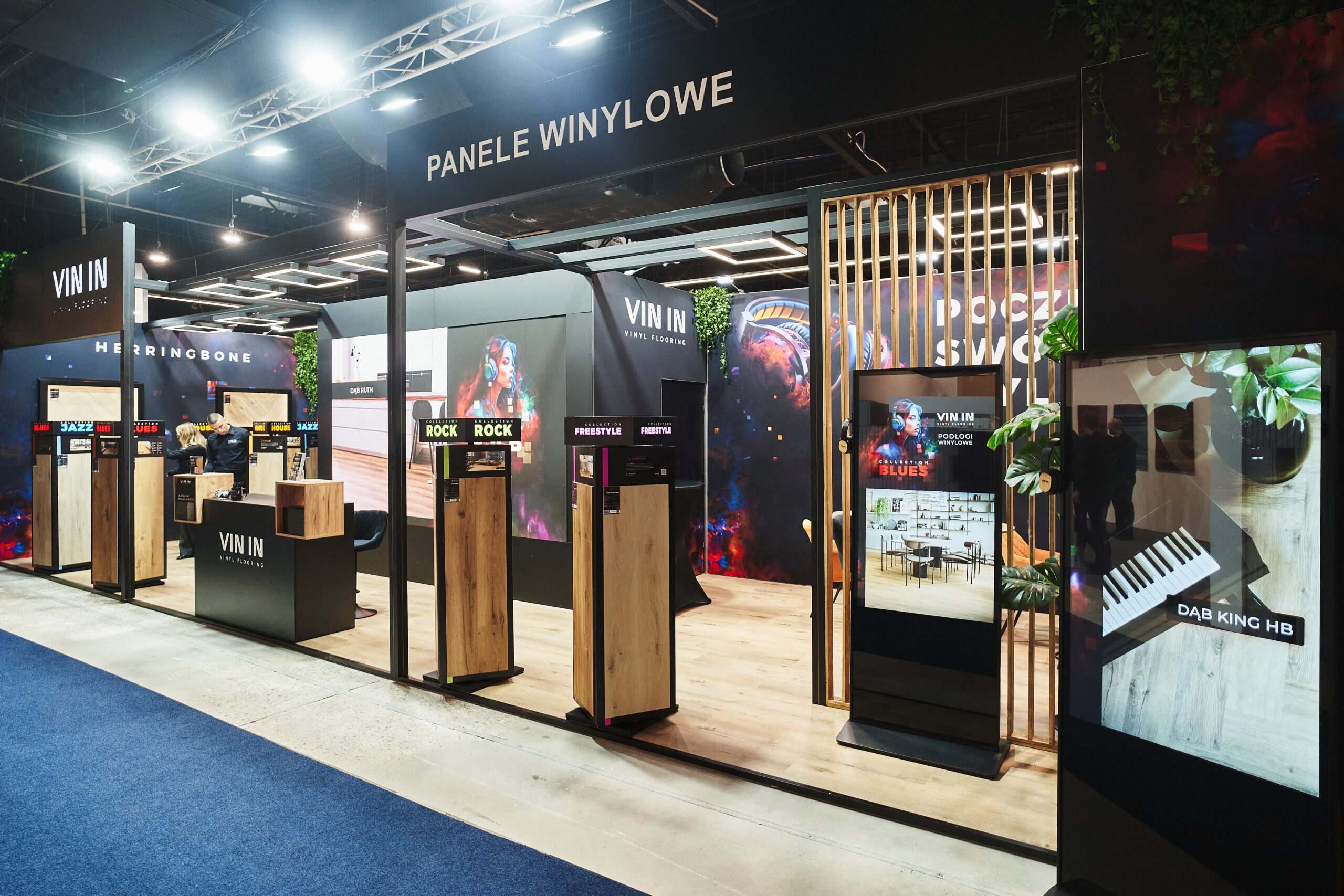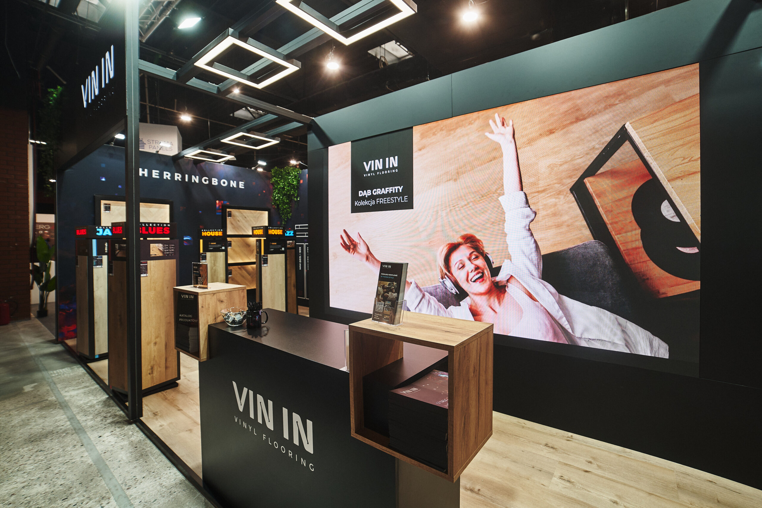 Kolekcje BLUES HERRINGBONE oraz HOUSE HERRINGBONE zdobiły podświetlone ekspozycje ścienne z profilami LED, które pięknie wydobyły ich strukturę oraz sposób łączenia za pomocą eleganckiej mikrofugi 4V. Odwiedzający mogli także obejrzeć mniejsze próbniki z widocznym zintegrowanym podkładem. Dzięki takiej oprawie oferta paneli winylowych została pokazana w pełnej, inspirującej odsłonie.