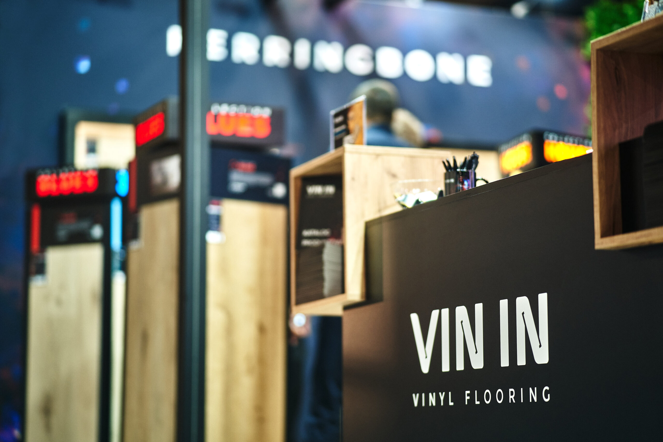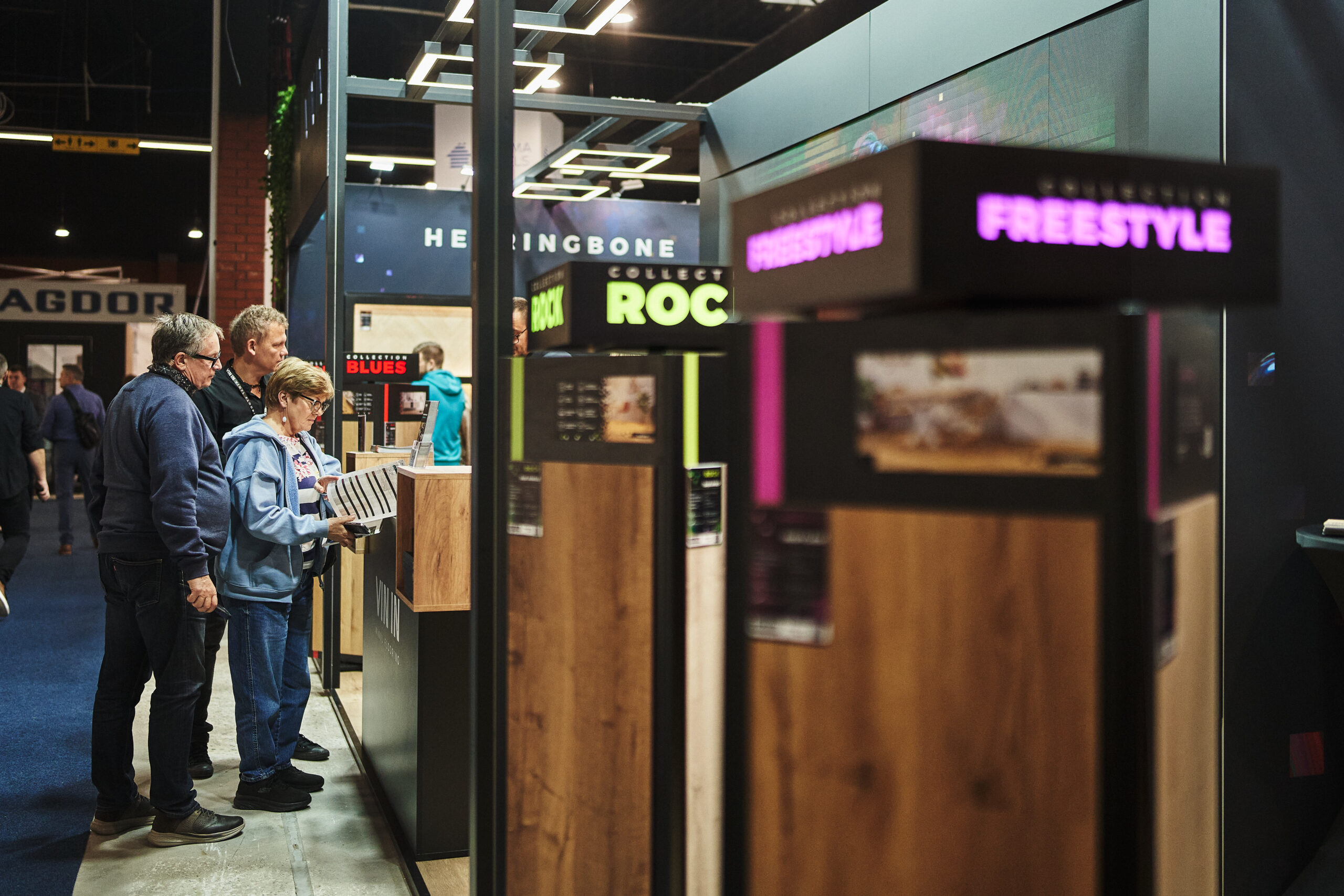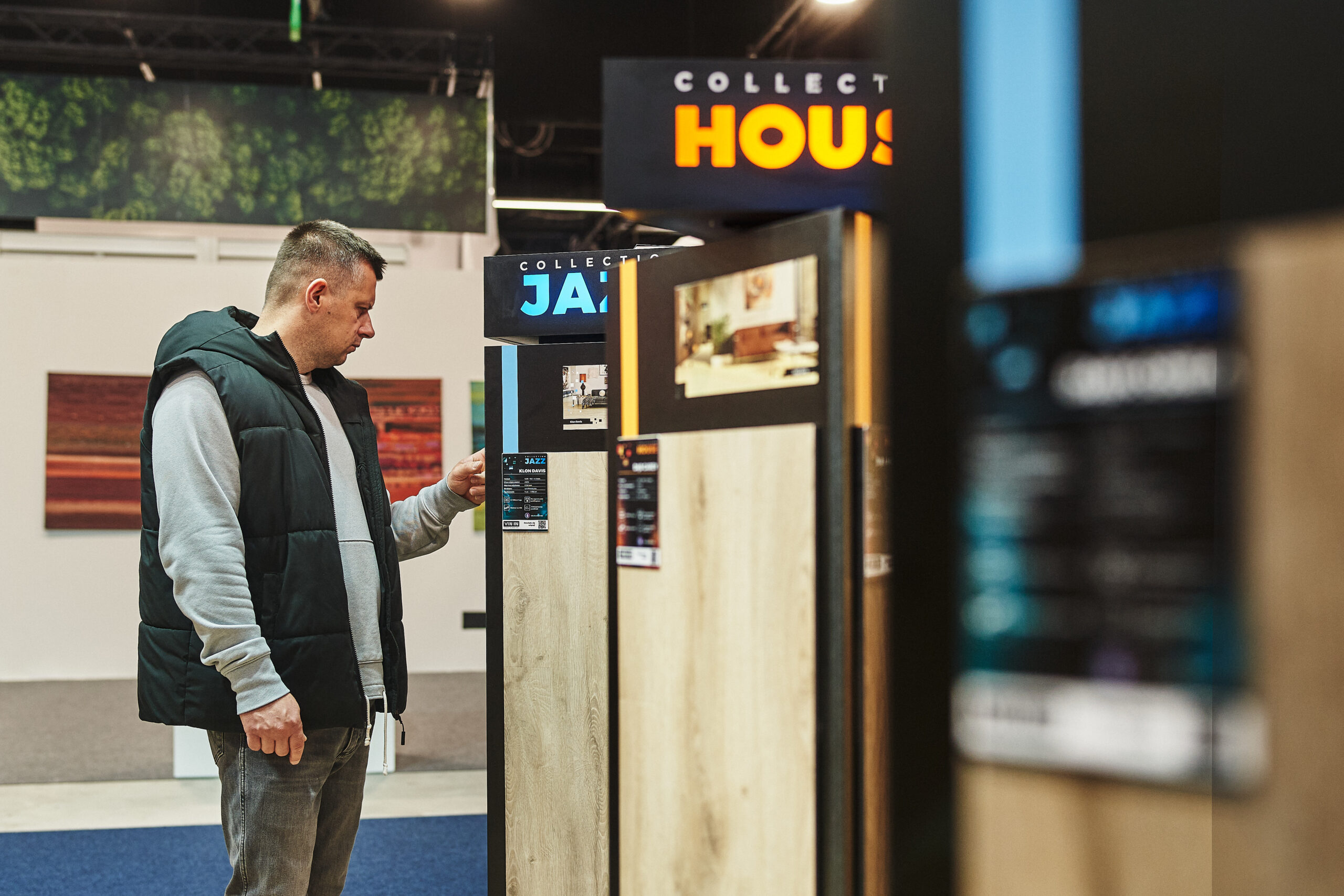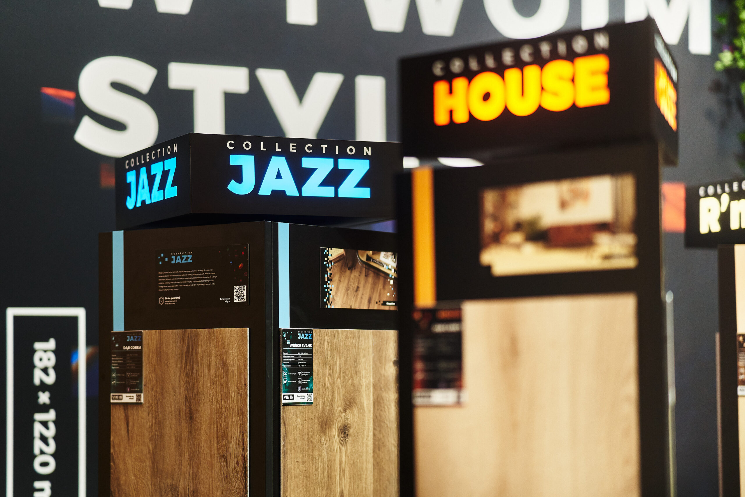 Kolekcje BLUES HERRINGBONE oraz HOUSE HERRINGBONE zdobiły podświetlone ekspozycje ścienne z profilami LED, które pięknie wydobyły ich strukturę oraz sposób łączenia za pomocą eleganckiej mikrofugi 4V. Odwiedzający mogli także obejrzeć mniejsze próbniki z widocznym zintegrowanym podkładem. Dzięki takiej oprawie oferta paneli winylowych została pokazana w pełnej, inspirującej odsłonie.