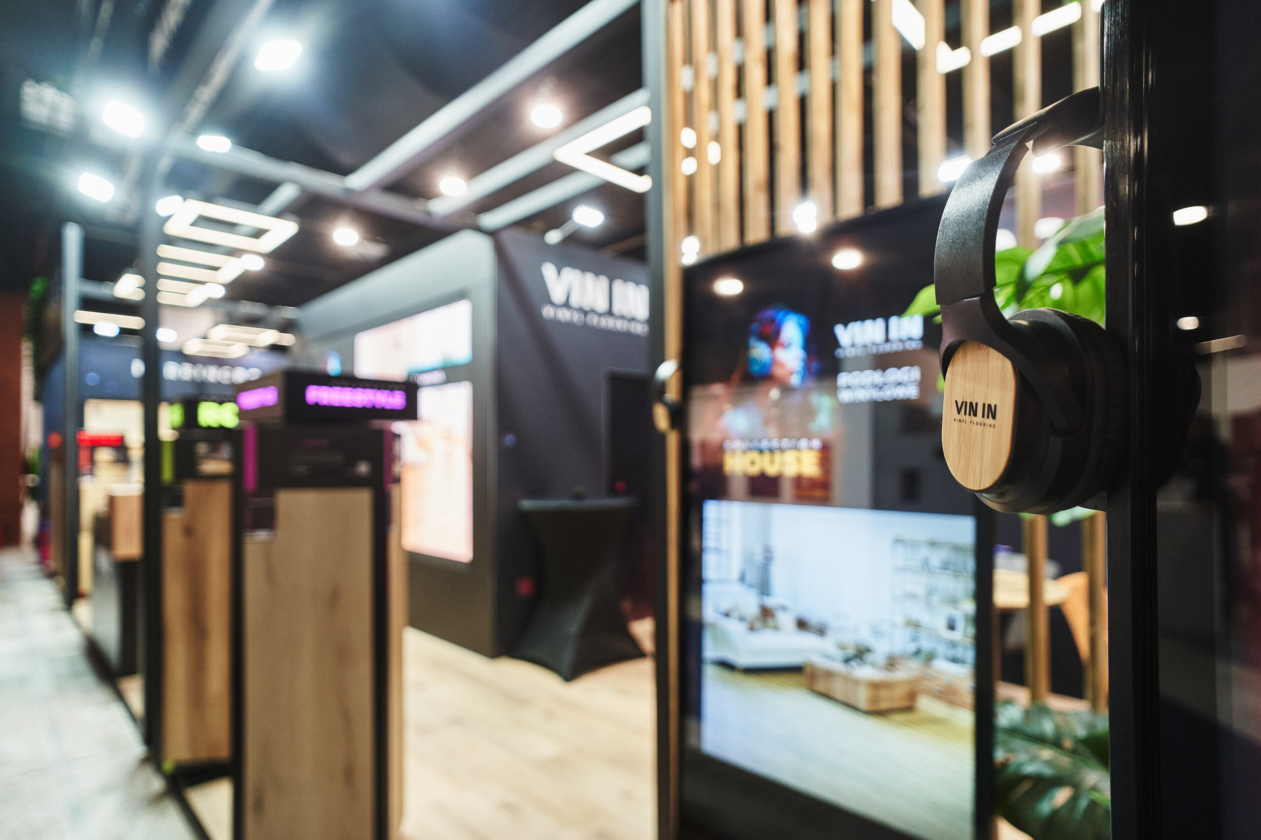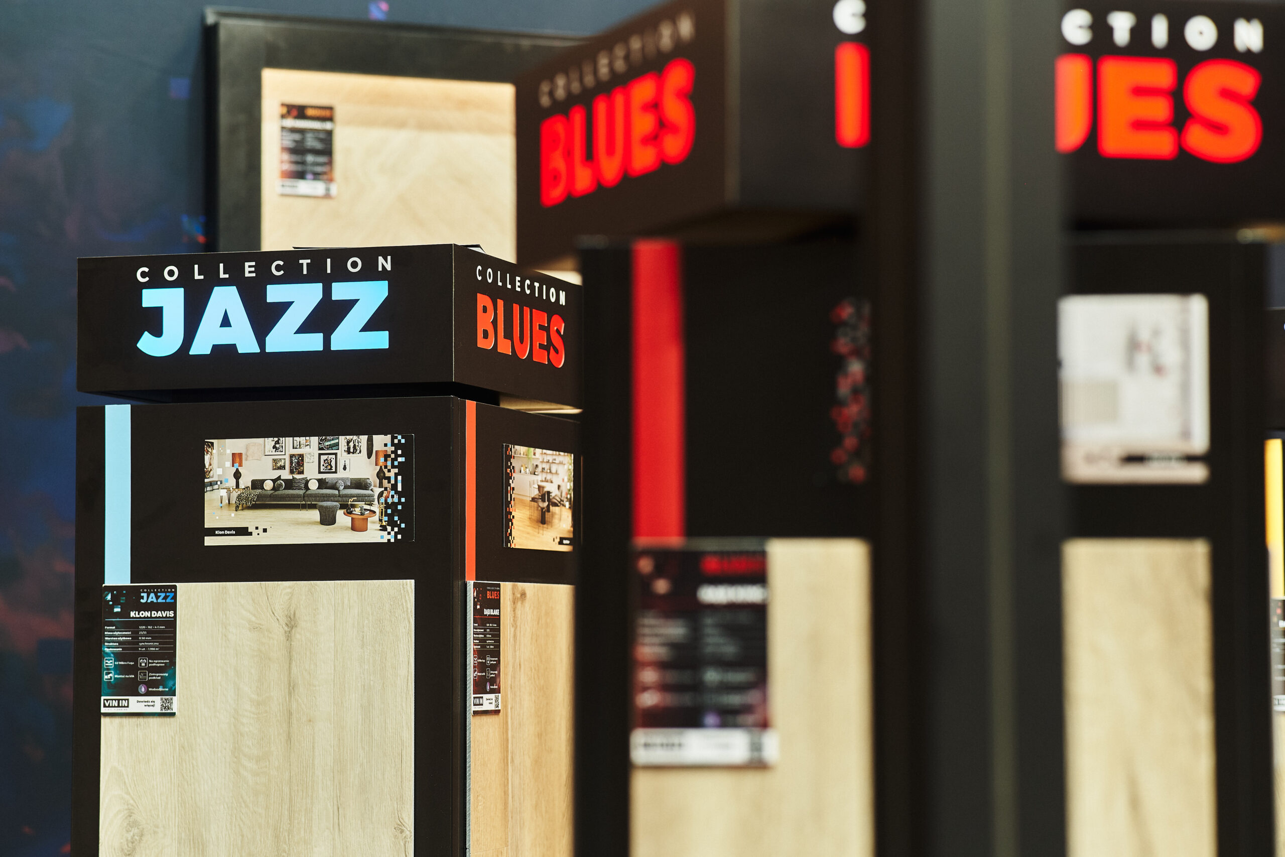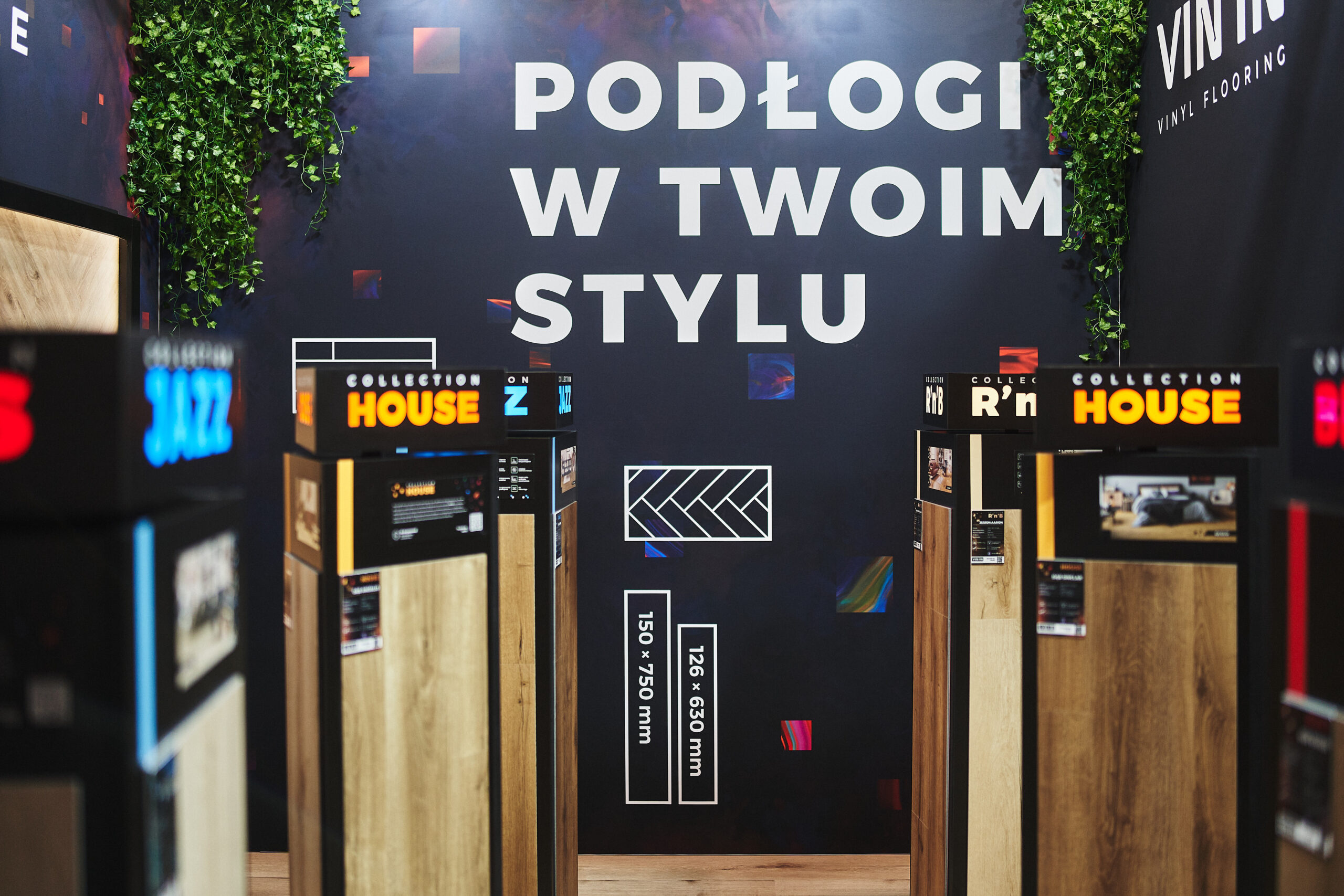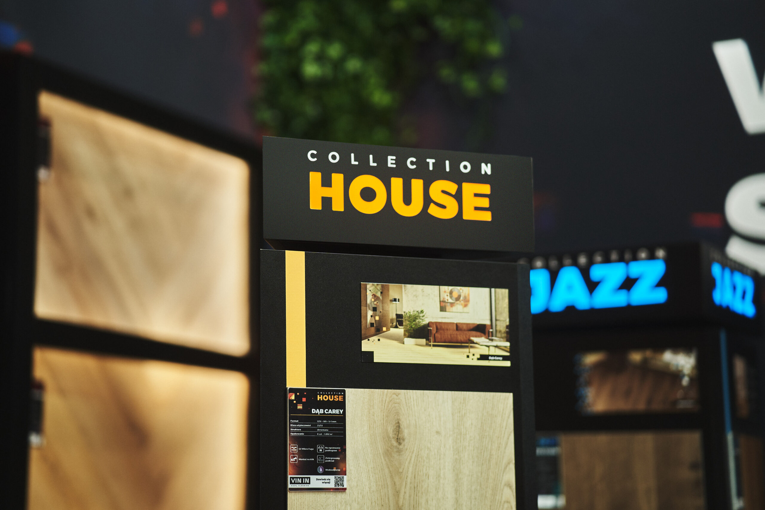 Kolekcje BLUES HERRINGBONE oraz HOUSE HERRINGBONE zdobiły podświetlone ekspozycje ścienne z profilami LED, które pięknie wydobyły ich strukturę oraz sposób łączenia za pomocą eleganckiej mikrofugi 4V. Odwiedzający mogli także obejrzeć mniejsze próbniki z widocznym zintegrowanym podkładem. Dzięki takiej oprawie oferta paneli winylowych została pokazana w pełnej, inspirującej odsłonie.