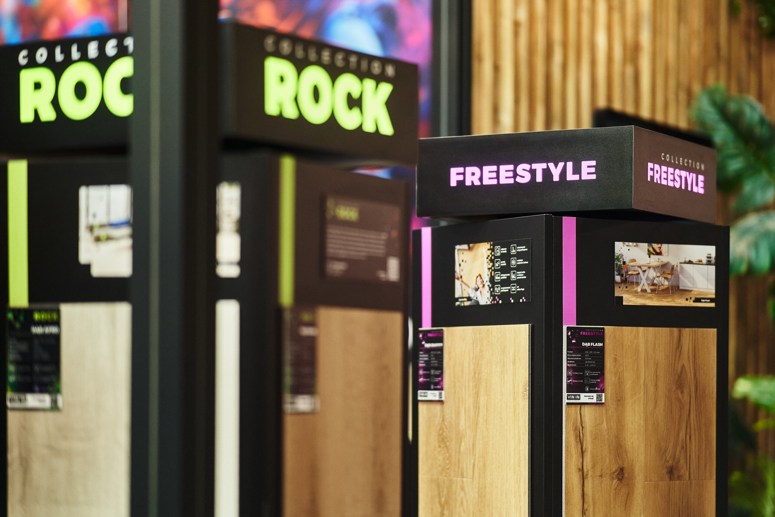 Panele winylowe VIN IN zaprezentowano w wyjątkowej aranżacji, która przyciągała uwagę odwiedzających. Aż 36 dekorów w 8 kolekcjach przedstawiono w formie przemyślanej ekspozycji – klasyczne wzory desek umieszczono na obrotowych stojakach z tabliczkami informacyjnymi i zdjęciami pokazującymi możliwe zastosowania.